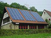 Hüffenhardt, Mehrzweckhalle: 12,96 kWp, SMA Wechselrichter, Aluminiumtragegestell Schrägaufständerung auf Karzipdach, Module: Solarex MSX120 Wp, 8 Investoren